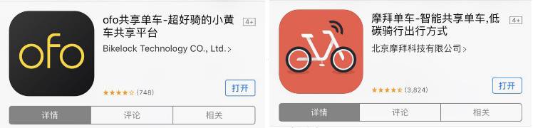 而在有評論打分的App里,評論數(shù)超過100的有6個,按評論數(shù)量由多到少分別是:摩拜單車,酷騎單車,hellobike,ofo,小藍(lán)單車,優(yōu)拜單車,評論人數(shù)最多的為摩拜單車,共有超過3000人評價,綜合得分為4.5分。
