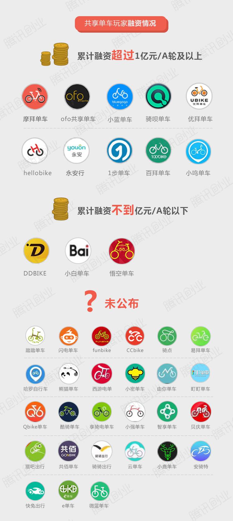 經(jīng)騰訊創(chuàng)業(yè)不完全統(tǒng)計,截至2017年3月31日,出現(xiàn)在App Store里的共享單車入局者已達(dá)40個。同時,共享單車行業(yè)融資額已經(jīng)超過70億元人民幣。