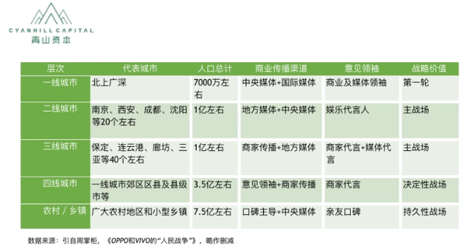 ? 銷售渠道下沉。高端消費(fèi)品做品牌,低端消費(fèi)品做渠道。中國城鄉(xiāng)差異巨大,有7.5億廣大人群的農(nóng)村,特別是3.5億人口的四線城鎮(zhèn)才是大多數(shù)消費(fèi)品的決定性戰(zhàn)場(見下圖)。小米之家在過去一年半全國開了一百多家門店,勢如破竹。我們把這一機(jī)會背后的驅(qū)動力也歸結(jié)為“好”字訣,對應(yīng)的其實(shí)是3~5線城市消費(fèi)人群的消費(fèi)升級。