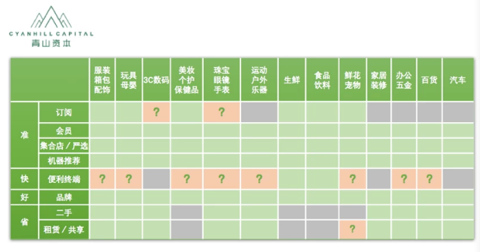 品類+模式機(jī)會矩陣。其中,綠色區(qū)域我們認(rèn)為有可能成立(哪怕概率很低),灰色我們認(rèn)為基本不存在機(jī)會。